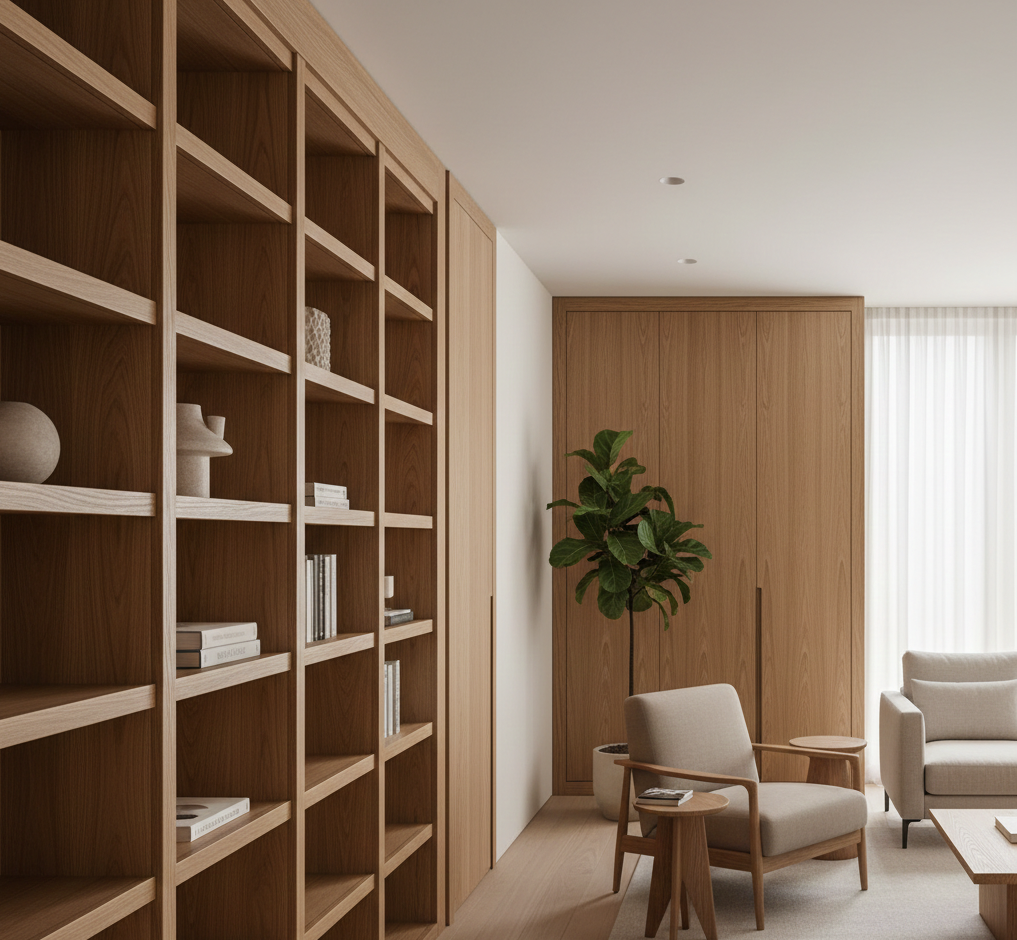 Il legno naturale ha una capacità unica di riflettere e assorbire la luce in modo morbido. Le essenze chiare, come rovere o frassino, valorizzano la luce naturale rendendo gli ambienti più luminosi e accoglienti. Le venature, mai identiche, creano micro-variazioni che donano maggiore profondità. Nell’arredamento su misura, la scelta dell’essenza non è mai casuale: viene studiata in base all’esposizione dell’ambiente, alla quantità di luce naturale e alla funzione dello spazio. Un mobile progettato correttamente può amplificare la luminosità senza ricorrere a soluzioni artificiali invasive.